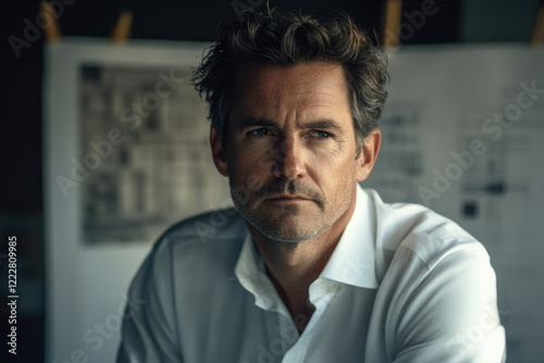 A middle-aged man with short, dark hair, wearing a white shirt, looks directly at the camera with a serious expression.