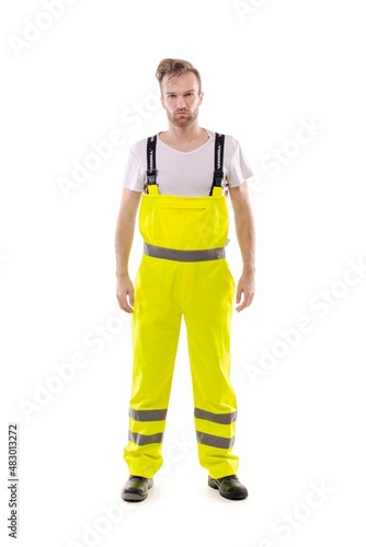 A middle-aged white man wearing a green working uniform standing over isolated white background looks happy. Worker and builder concept.
