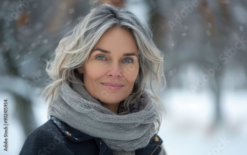 A middle-aged woman with silver hair smiles warmly while wearing a soft scarf, surrounded by a serene winter landscape with gently falling snowflakes