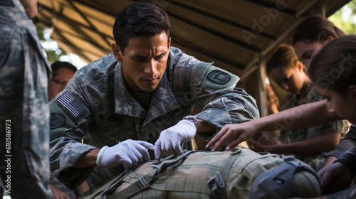 A military medical officer instructing soldiers on basic first aid and emergency medical techniques Generative AI