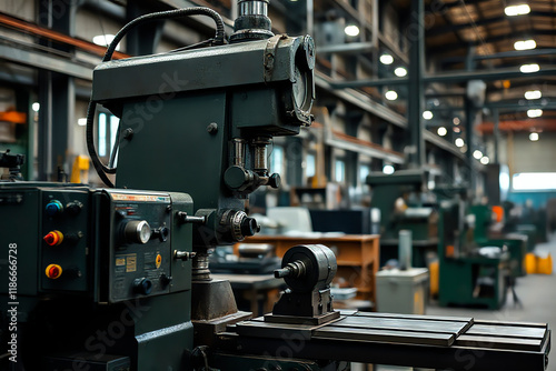 A milling machine actively processes metal components in a bustling factory setting filled with equipment and machinery