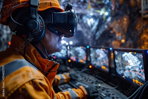 A mine worker collaborates with advanced virtual reality equipment while monitoring screens. This high-tech approach improves efficiency in underground operations