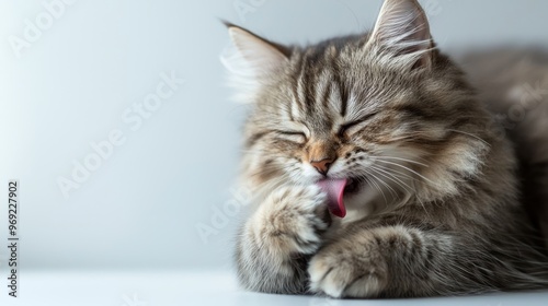 A miniature dwarf cat grooming itself on a bright white surface, its tongue licking its paw