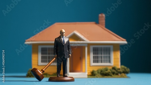 A miniature figurine of a man in a suit standing in front of a miniature house with a gavel in the foreground, representing a real estate auction.