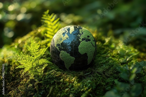 A miniature globe sits on a bed of lush green moss, symbolizing the importance of nature and environmental protection.
