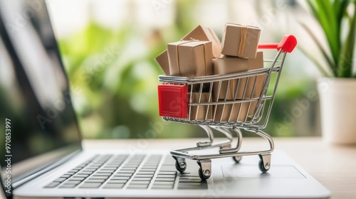 A miniature shopping cart filled with small cardboard boxes sits on a laptop keyboard, symbolizing online shopping.
