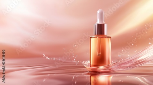 A minimal dropper releasing glowing collagen serum, blending seamlessly with a tranquil pastel background.