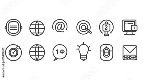 A minimal line icon set featuring universal symbols, each designed with simplicity and clarity in mind. The icons are displayed on a white background, ready for use in digital interfaces and