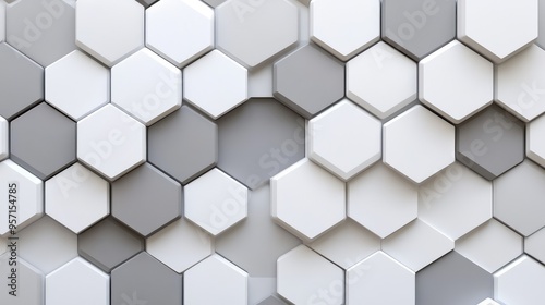 A minimalist abstract pattern of overlapping hexagons in shades of white and gray, creating a clean, modern design