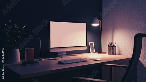 A minimalist aesthetic desktop workspace setup at night with blank screen computer and copy space for your design.