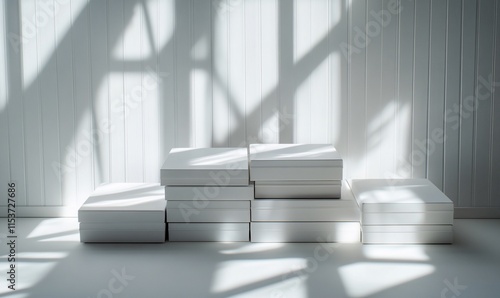 A minimalist arrangement of white boxes casting shadows in a bright space.