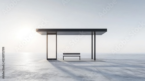A minimalist bus stop with a clean, modern design, set in an open urban area under a clear sky.