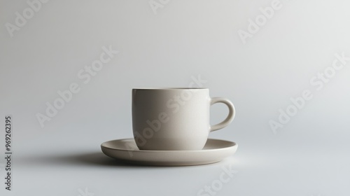 A minimalist ceramic cup on a matching saucer against a soft, neutral background.
