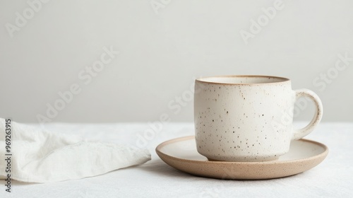 A minimalist ceramic cup on a plate, accompanied by a cloth, evoking a calm atmosphere.