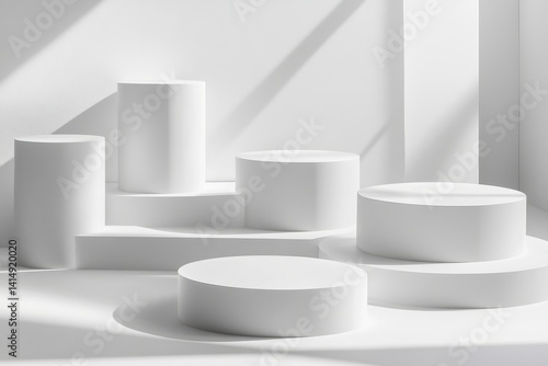 A minimalist display featuring white geometric shapes under natural light casting shadows on a bright surface