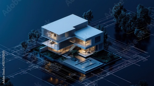 A minimalist geometric house blueprint floating on a modern design grid