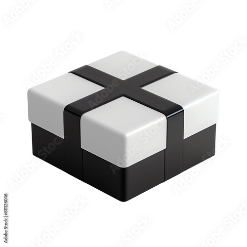 A minimalist gift box in monochrome black and white with a sleek design, showcased in 3D isometric perspective, isolated on transparent background