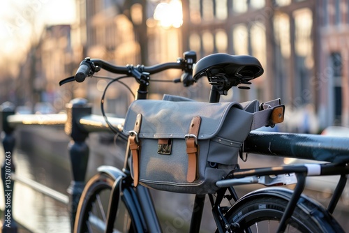 A minimalist gray messenger bag secured on a bicycle rack, set against a blurred European city background, epitomizing urban commuting and sustainable lifestyle choices. MZ