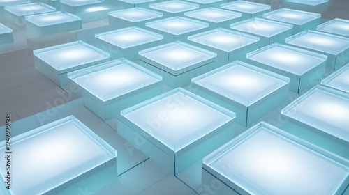 A minimalist grid of light blue and white squares, each emitting a soft glow, creating a representation of digital data