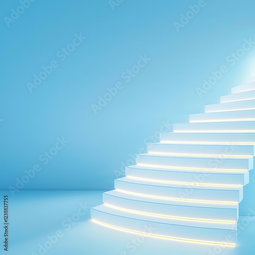 A minimalist, illuminated staircase rises against a soft blue background, creating a serene and modern atmosphere.