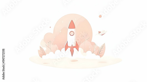 A minimalist illustration of a rocket launching amidst soft clouds and pastel colors.