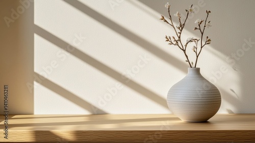 A minimalist modern office features a simple light grey ceramic vase holding delicate sp branches artfully arranged on a light wood shelf bathed in soft sunlight creating a