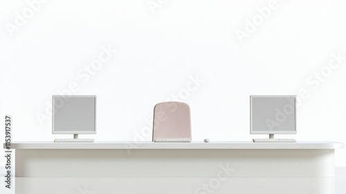 A minimalist office setup featuring a central chair with two computers on either side, set against a plain white background.