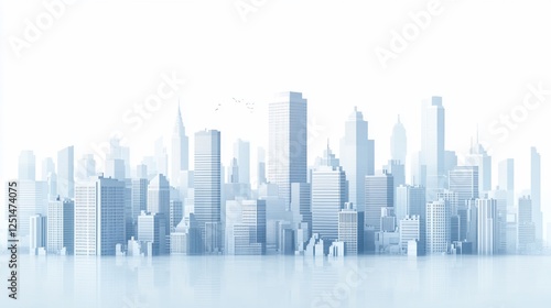 A minimalist pale blue cityscape against a white background with bird silhouettes in sky