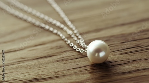 A minimalist pearl pendant on a delicate chain, resting on a plain wooden background.