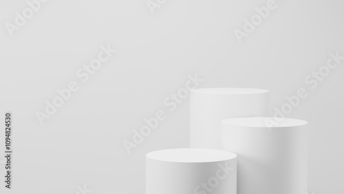 A minimalist product display with cylindrical podiums of varying heights and colors. For product presentation. 3D rendering.