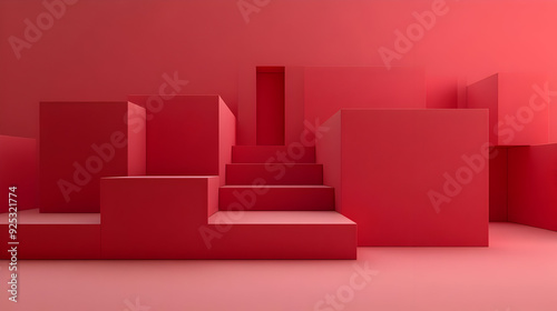 A minimalist red space featuring geometric shapes and steps.