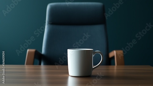 A minimalist scene featuring a white mug on a wooden table, with a dark blue wall and an office chair in the background, suggesting a professional workspace.