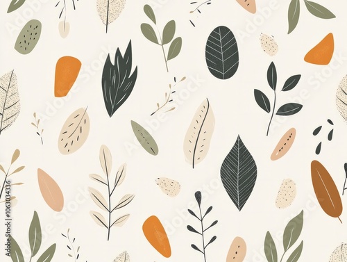 A minimalist seamless pattern with hand-drawn leaves and plant-based icons, symbolizing biodegradable materials, in muted greens and browns