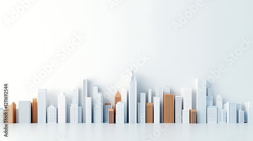 A minimalist skyline featuring an array of white and wooden buildings against a light background, showcasing urban architecture.