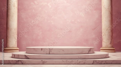 A minimalist space featuring marble steps and tall columns against a soft pink wall, evoking a serene and elegant atmosphere.