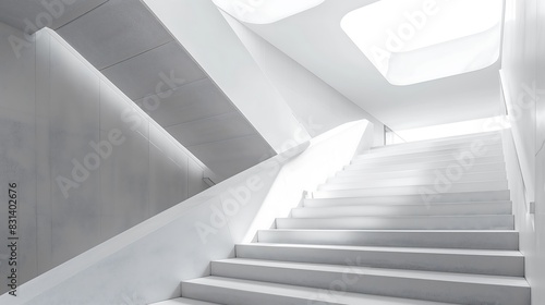 A minimalist staircase with a clean, geometric design and a series of small, square skylights above