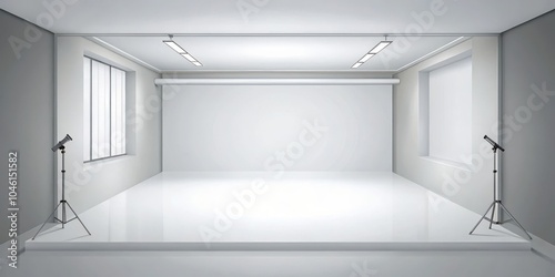 A Minimalist Studio Space with White Walls, a Clean Platform, and Two Professional Lights on Tripods