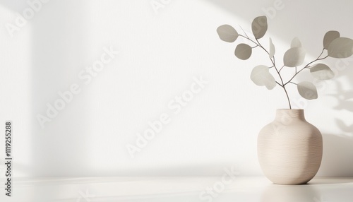 A minimalist vase with delicate leaves is positioned against a bright, neutral background, creating a serene and calming atmosphere.