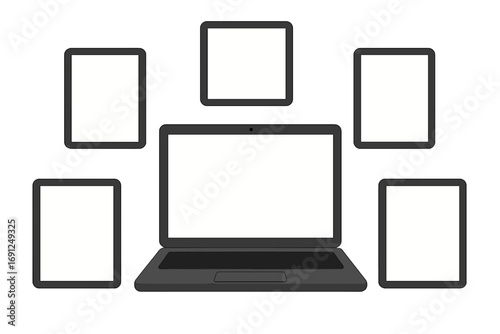 A minimalist vector illustration set featuring top‑view mockups of generic devices like smartphones, laptops, and tablets, ideal for infographics or presentations as modern communication tools