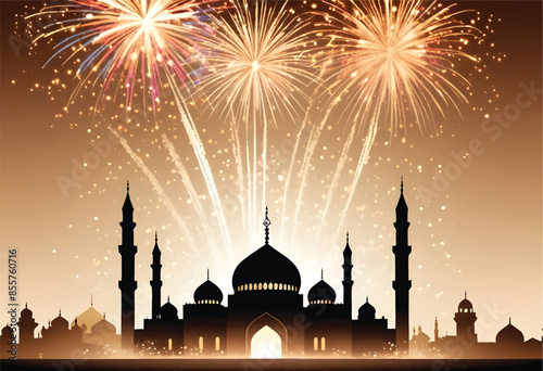 a minimalist vector of a mosque silhouette with colorful fireworks bursting to the sky