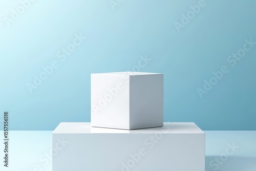 A minimalist white cube displayed on a larger white rectangular platform set against a soft blue background.