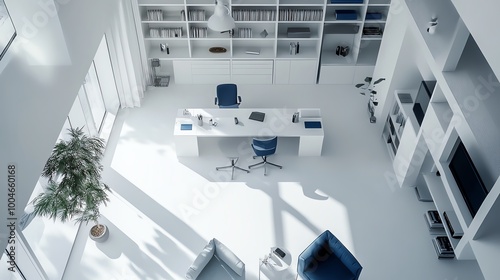 A minimalist white home office with large windows, a desk, and a bookshelf. Sunlight streams through the windows.