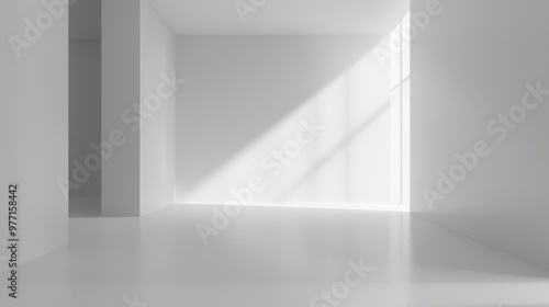 A minimalist white room with a large window casting a beam of sunlight onto the floor