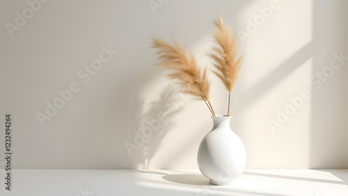 A minimalist white vase holds pampas grass in soft sunlight, casting gentle shadows on a light background, creating a serene and calming atmosphere