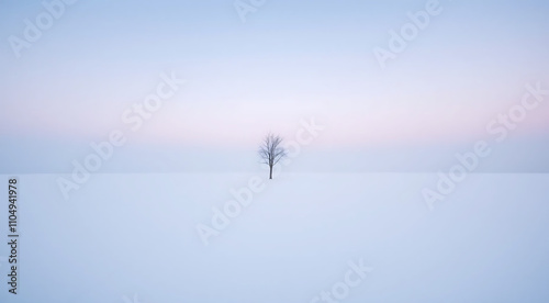 A minimalist winter composition: an endless expanse of untouched snow with a single, bare tree standing in the middle. The sky is an ethereal gradient of icy blue transitioning to pale pink, giving a