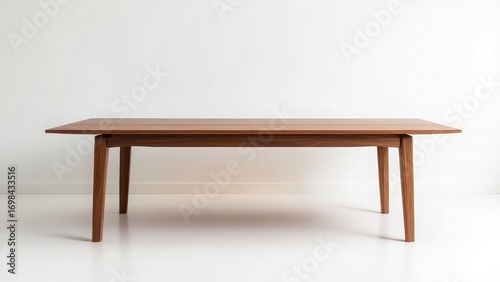 A minimalist wooden table with four legs against a white background in a studio setting showing detail