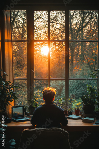 A minimalist workspace by a large window, sunlight pouring in as a person sketches ideas on a tablet,