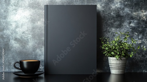A minimalist workspace featuring a black notebook, a coffee cup, and a decorative plant against a textured gray backdrop.