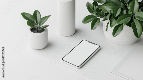 A minimalist workspace featuring a smartphone, plants, and simple decor.