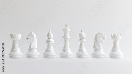A minimalistic arrangement of white chess pieces against a neutral background, highlighting strategy and elegance in a creative display.
